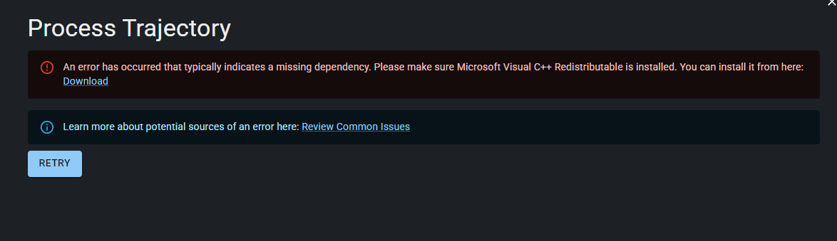 Rock Desktop is failing to process SLAM data. Processing fails immediately saying dependcies are missing, referring to C++ distributable, however they are installed.